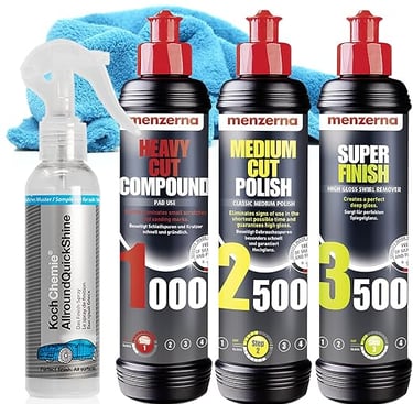 Kit de pulido profesional que combina los compuestos Menzerna 1000, 2500 y 3500 para un proceso completo de corte, refinado y acabado, junto con QuickShine de Koch Chemie para realzar el brillo final y proteger la superficie.